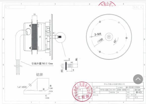 型号:YY74-220 产品类型:单相异步电机 耐高温:0-180 ℃ 额定功率:25w 额定电压:220v/50HZ 负载转速:2122rpm ±150 产品认证:CCC、CE 应用范围:高温烘焙,60升烤箱等